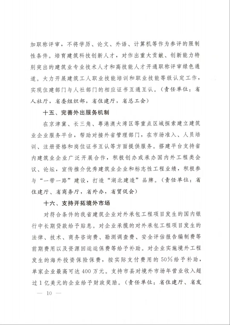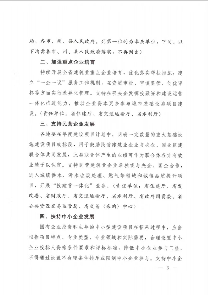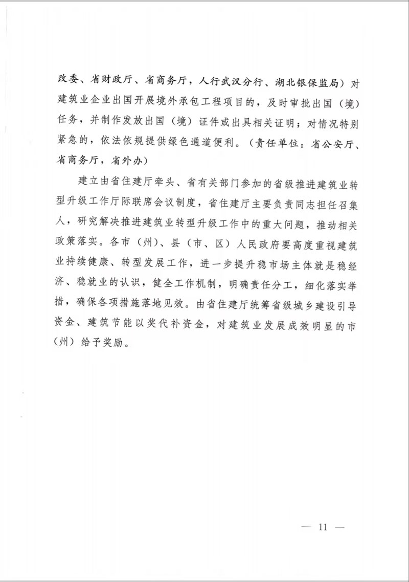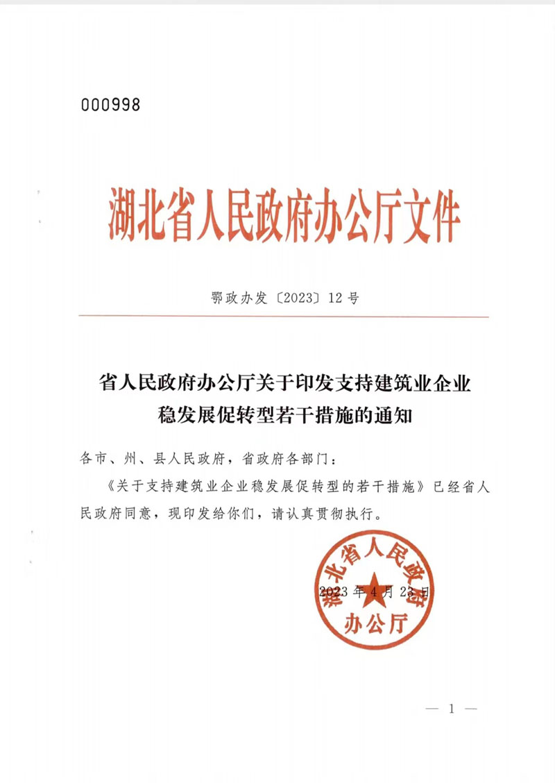 湖北省人民政府辦公廳關于印發(fā)支持建筑業(yè)企業(yè)穩(wěn)發(fā)展促轉型若干措施的通知