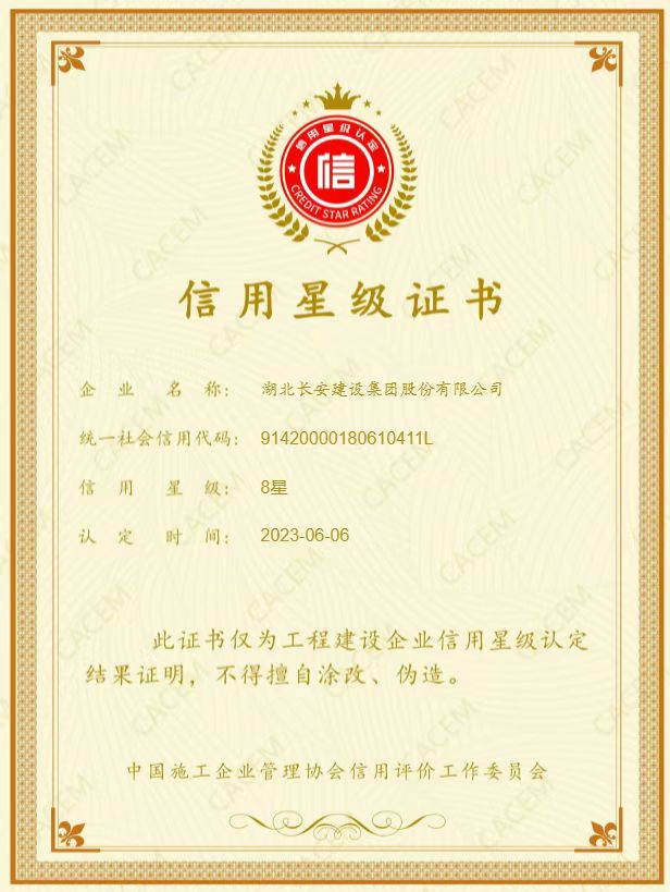 6月16日,中國施工企業(yè)管理協(xié)會官網(wǎng)發(fā)布《關(guān)于公布2023年第八批工程建設(shè)企業(yè)信用星級認(rèn)定結(jié)果的通知》,湖北有8家工程建設(shè)企業(yè)上榜,集團公司是唯一被認(rèn)定“8星”信用的工程建設(shè)企業(yè)。