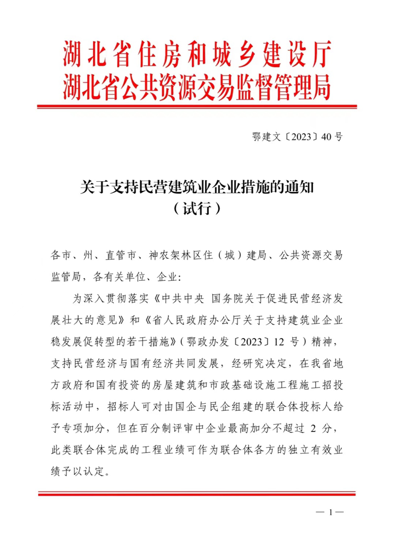 湖北省住房和城鄉(xiāng)建設(shè)廳、湖北省公共資源交易監(jiān)督管理局 關(guān)于支持民營建筑業(yè)企業(yè)措施的通知(試行)