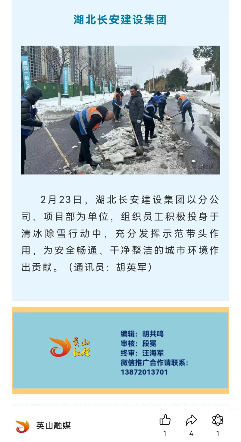 黃岡新聞網(wǎng)訊(通訊員 胡英軍)2月21日起,黃岡各地出現(xiàn)大范圍低溫雨雪冰凍天氣,給群眾出行和生活帶來(lái)不便。為有效防范應(yīng)對(duì)極端天氣,保障群眾生產(chǎn)生活安全,湖北長(zhǎng)安建設(shè)集團(tuán)聞令而動(dòng),集團(tuán)下屬各公司、分公司積極投入到抗擊冰雪一線。