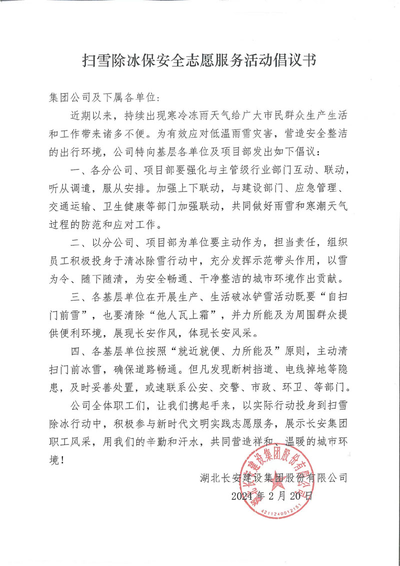 2月20日下午,湖北長(zhǎng)安建設(shè)集團(tuán)向下屬各公司發(fā)布《掃雪除冰保安全志愿服務(wù)活動(dòng)倡議書(shū)》,倡議各分公司、項(xiàng)目部強(qiáng)化與主管級(jí)行業(yè)部門互動(dòng)、聯(lián)動(dòng)聽(tīng)從調(diào)遣,服從安排。加強(qiáng)上下聯(lián)動(dòng),與建設(shè)部門、應(yīng)急管理交通運(yùn)輸、衛(wèi)生健康等部門加強(qiáng)聯(lián)動(dòng),共同做好雨雪和寒潮天氣過(guò)程的防范和應(yīng)對(duì)工作。要求以分公司、項(xiàng)目部為單位,主動(dòng)作為,組織員工積極投身于清冰除雪行動(dòng)中,為安全暢通、干凈整潔的城市環(huán)境作出貢獻(xiàn)。