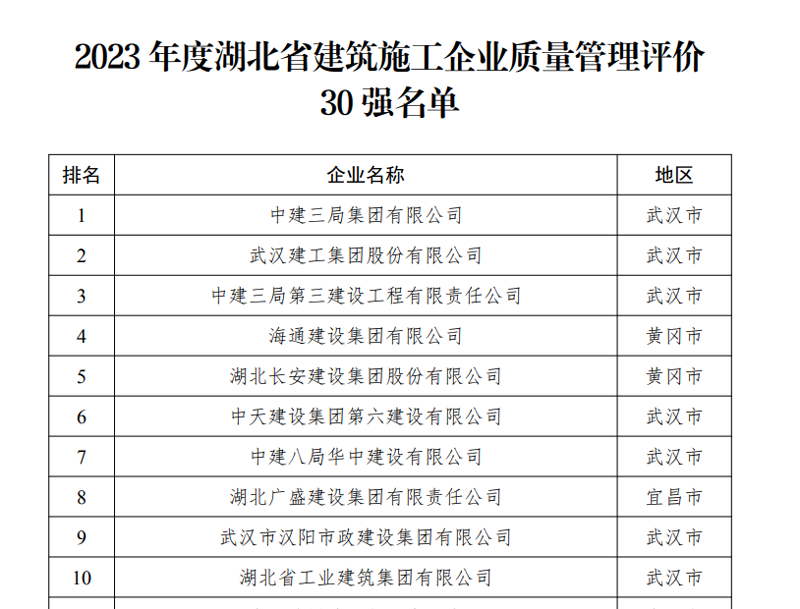 日前,湖北省建設(shè)工程質(zhì)量安全協(xié)會(huì)官網(wǎng)發(fā)布了《關(guān)于公布2023年度湖北省建筑施工企業(yè)質(zhì)量管理評價(jià)30強(qiáng)名單的通知》,湖北長安建設(shè)集團(tuán)股份有限公司在30強(qiáng)中排名第5位,比上一屆上升4位。