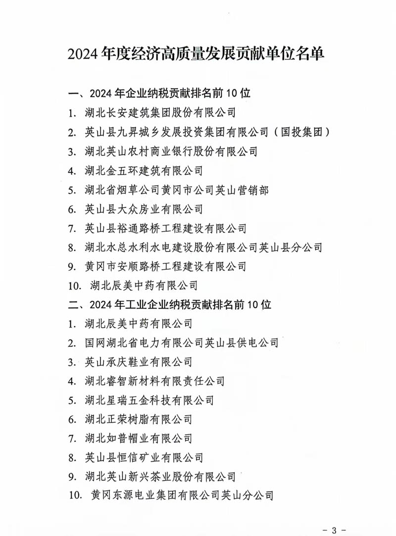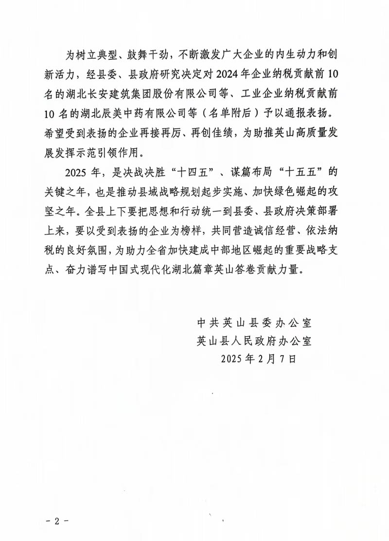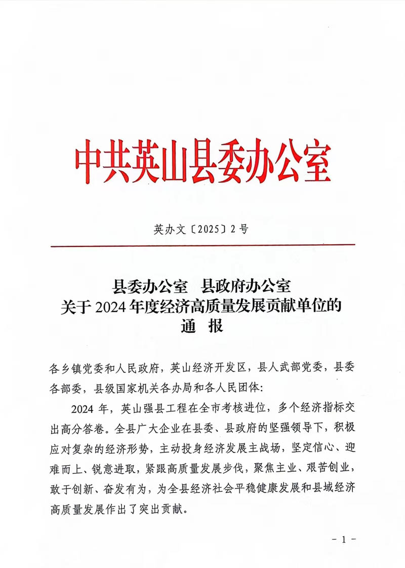 2月10日,英山縣2025年三級干部會議在英山縣禮堂召開。集團公司榮庸“2024年度經濟高質量發(fā)展貢獻單位”稱號,在“2024年企業(yè)納稅貢獻排名前10位”中榮居第1位。