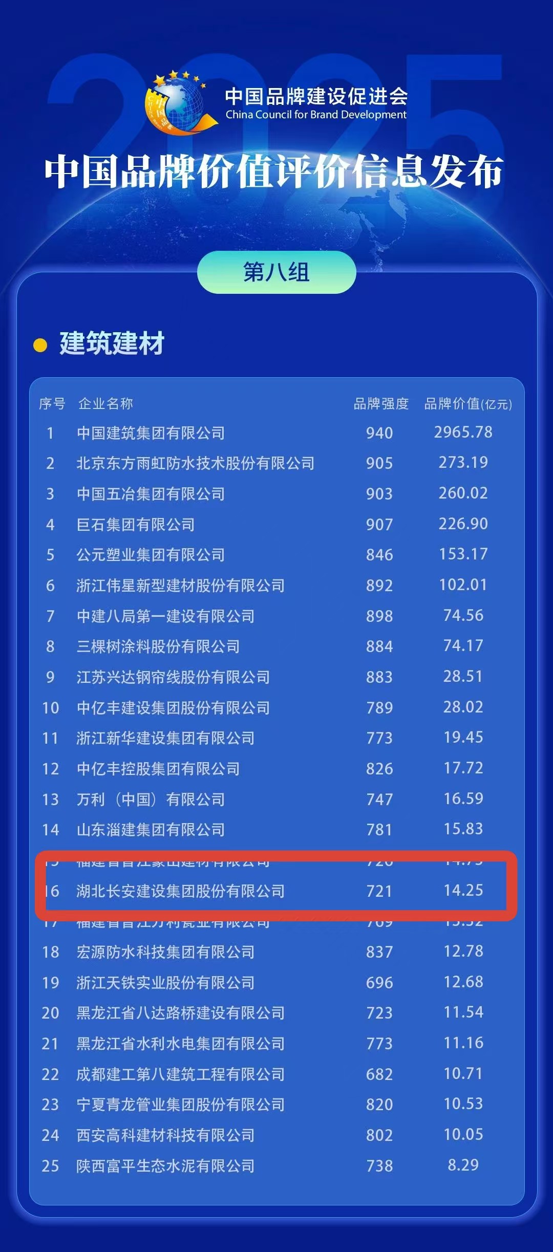 5月10日,在浙江省德清縣召開的2025世界品牌莫干山大會上,中國品牌建設促進會、中國資產(chǎn)評估協(xié)會、新華社等單位聯(lián)合對“2025中國品牌價值評價信息”開展權威發(fā)布。英山縣本土企業(yè)品牌、“湖北長安建設集團股份有限公司”入圍建筑建材組榜單第16位,其品牌強度為721,品牌價值14.25億元,較上一年度增長1.04億元,再創(chuàng)歷史新高。