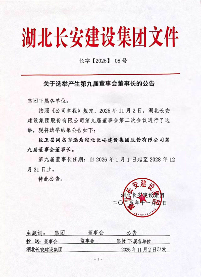 依據(jù)《湖北長安建設(shè)集團(tuán)股份有限公司章程》規(guī)定,2025年11月2日,經(jīng)湖北長安建設(shè)集團(tuán)股份有限公司第九屆董事會第二次會議選舉,段衛(wèi)昌同志擔(dān)任湖北長安建設(shè)集團(tuán)股份有限公司第九屆董事長。任期:自2026年1月1日起至2028年12月31日止。