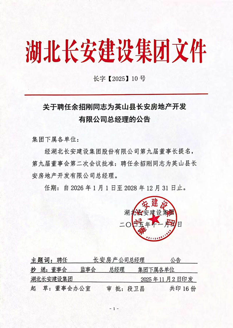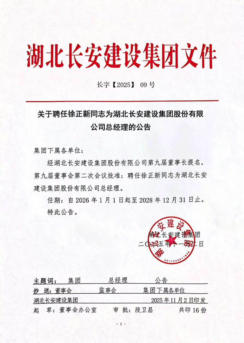 2025年11月2日,經(jīng)湖北長(zhǎng)安建設(shè)集團(tuán)股份有限公司第九屆董事長(zhǎng)提名,第九屆董事會(huì)第二次會(huì)議批準(zhǔn):聘任徐正新同志為湖北長(zhǎng)安建設(shè)集團(tuán)股份有限公司總經(jīng)理,聘任余招剛同志為英山縣長(zhǎng)安房地產(chǎn)開(kāi)發(fā)有限公司總經(jīng)理。上述兩項(xiàng)聘任任期一致,均自2026年1月1日起至2028年12月31日止。