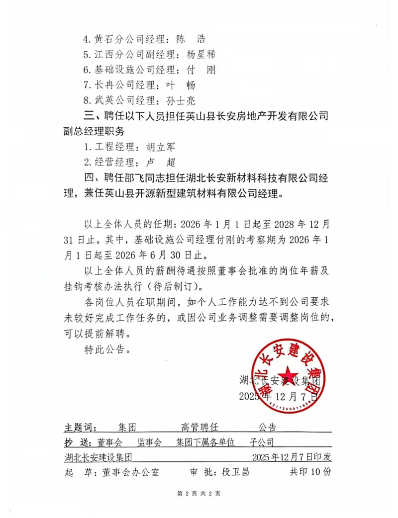 湖北長(zhǎng)安建設(shè)集團(tuán)關(guān)于聘任下屬公司高管的公告