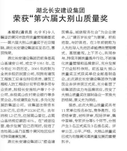 湖北長安建設(shè)集團榮獲“第六屆大別山質(zhì)量獎”