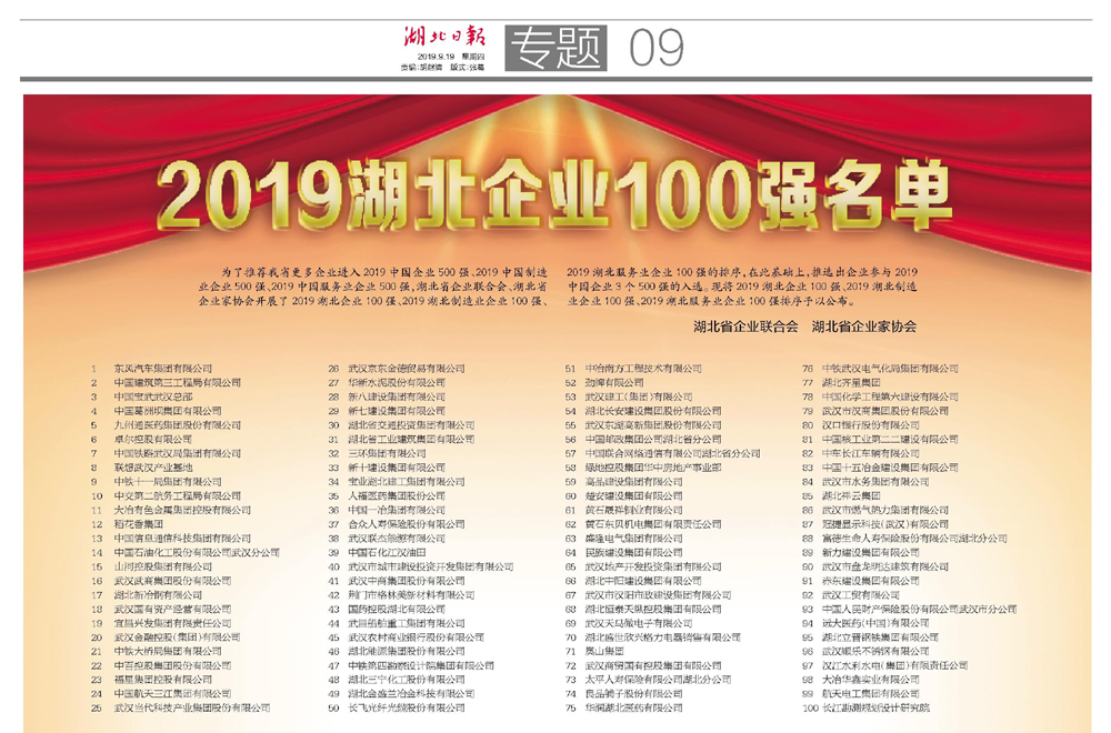 熱烈祝賀集團(tuán)公司榮獲2019湖北企業(yè)100強第54位