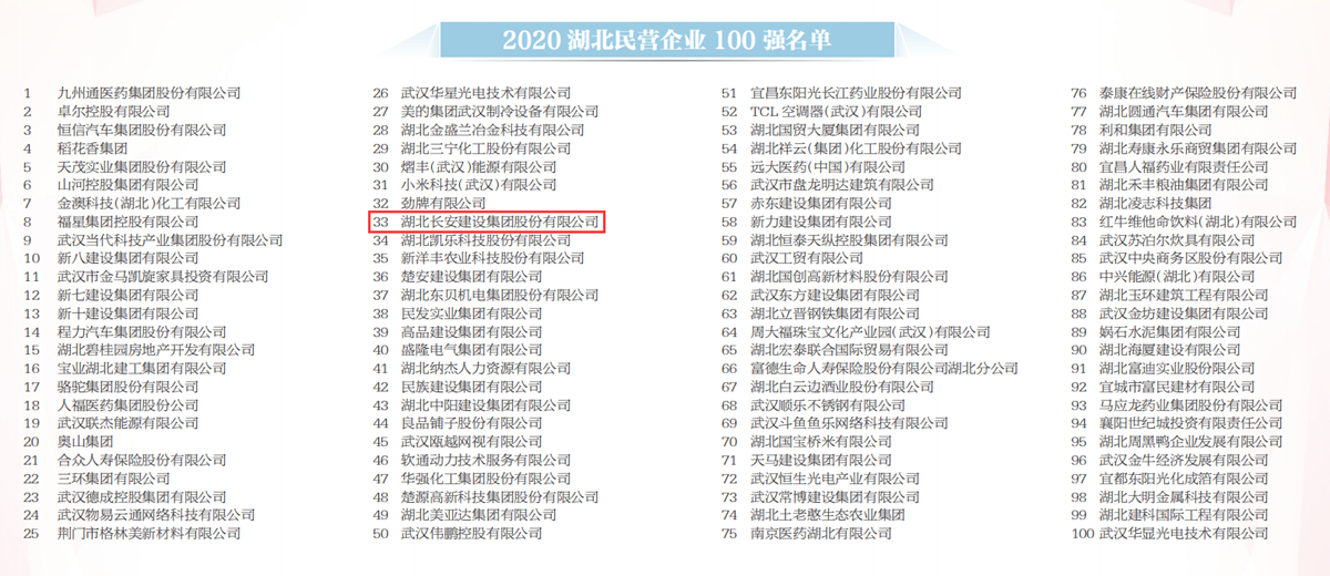 湖北長(zhǎng)安建設(shè)集團(tuán)再次榮膺湖北民營(yíng)企業(yè)100強(qiáng)